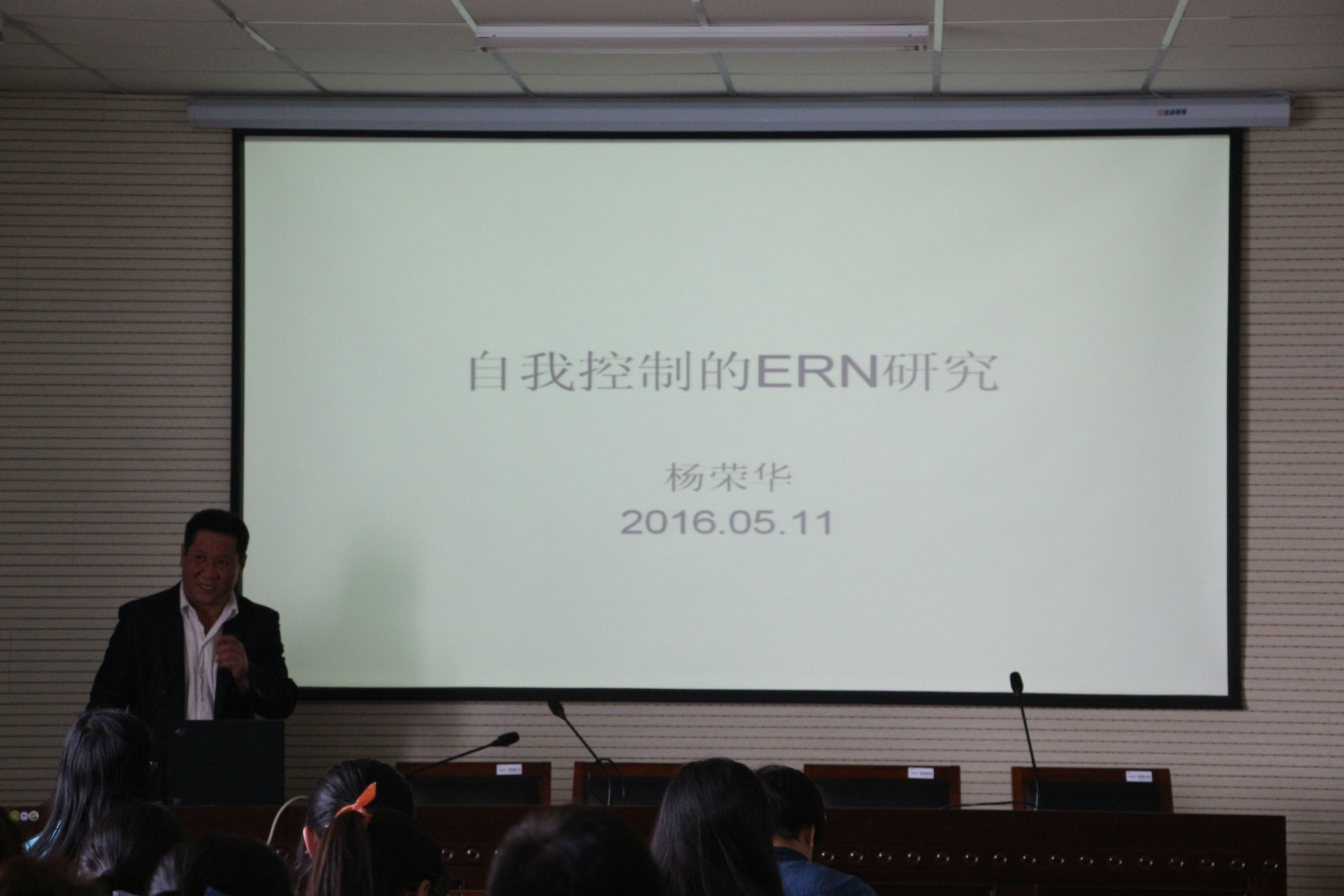 会议开始,首先杨荣华博士上台讲述自己研究的以自动控制为背景,探讨ERN增大或减小实验报告。首先他阐述了ERN的有关概念以及研究方式、理论解释等。提出来了冲突监控理论、预期违反假说来证明ERN含量变化和动机、个体差异有关。接着,杨荣华博士展示了情绪症状方面的个体差异研究、一些正性因素的研究和研究范式的问题。提出来了“正负性因素导致ERN增大或减小相同时,这是相同性质的ERN吗?”的问题。还提出了想申请关于ERN的研究的学术课题。报告后,他虚心地希望同学们和各位专业同仁提出意见以及各种学术问题。会上应心151班王玲玉同学首先积极提问,接着各个老师也都提出来各自的见解和给出了意见,会上讨论十分热烈。