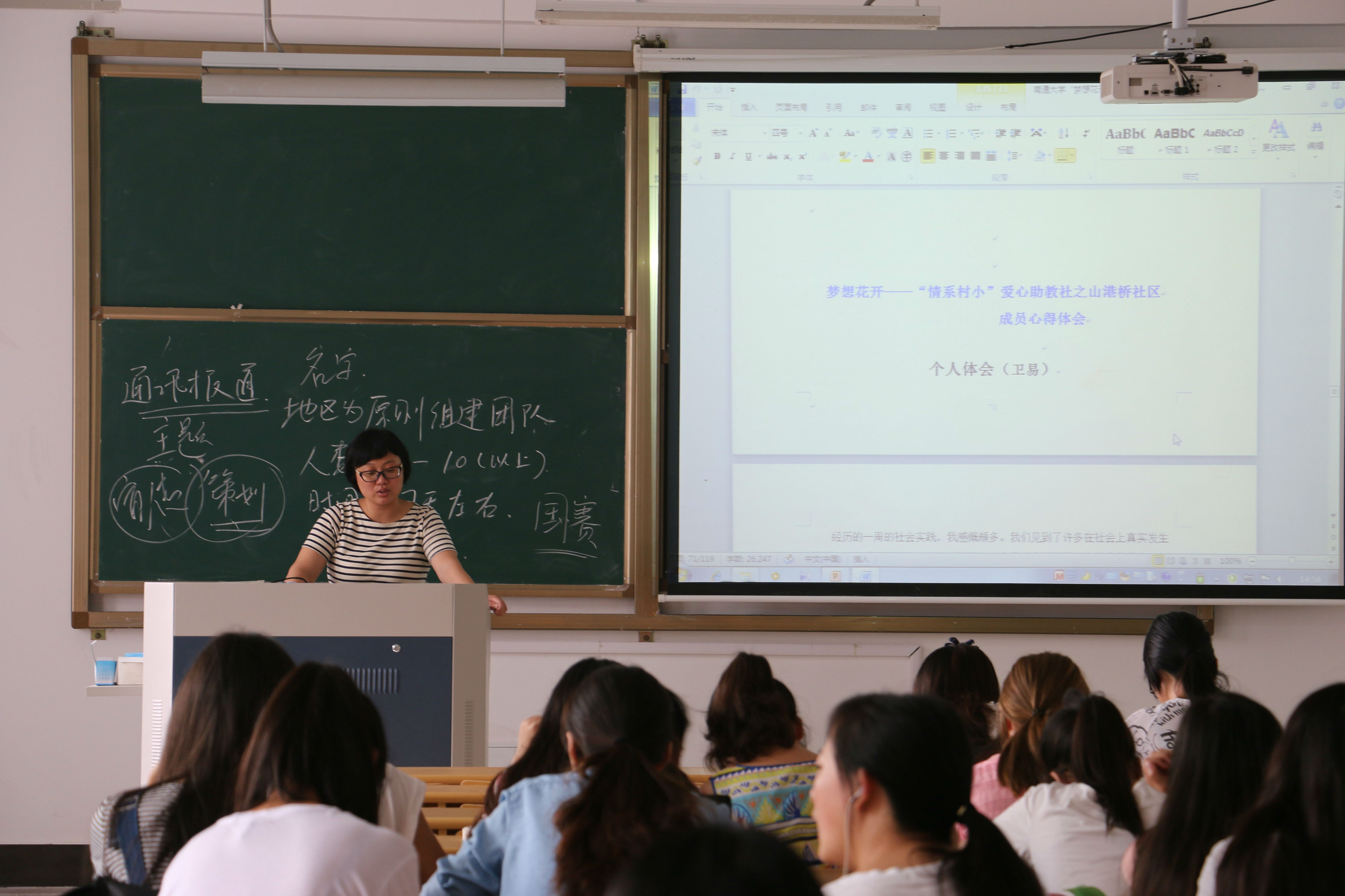 大会开始,魏老师简单介绍了暑期挂职社会实践,鼓励学生们积极参与。接着向在座学生简述了社会调研、专业实习、实践服务和志愿服务等社会实践主题的内容及选题指南。期间,老师建议同学们以团队为单位做好一项暑期社会实践,发挥集体力量,相互学习,共同进步。另外,魏老师指出:要完成一项好的实践项目不但要有一个好的名称、策划书,更要有详细具体的总结,这些内容对于后期评优以及自身锻炼都很重要,要重视每一个环节。最后,老师向同学们展示了往届优秀实践活动的材料以及总结。