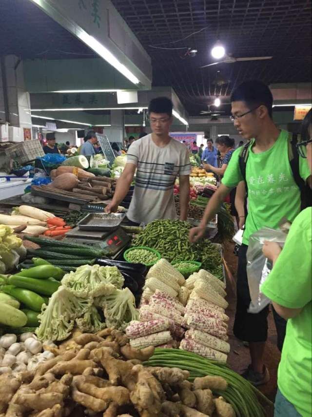 2016年7月6日,“爱在暮光小手牵大手”关爱社区老人志愿服务团按照预定计划,准备为虹桥社区惠乐邻里餐厅的老人做一顿丰盛的午餐。为了买到新鲜的食材,大早6:30所有队员们来到虹桥菜市场,分成两组采办食材,根据周三的菜谱,队员们购买了青菜、香菇、豆腐、土豆、黄瓜、猪肉等,一同前往惠乐邻里餐厅。