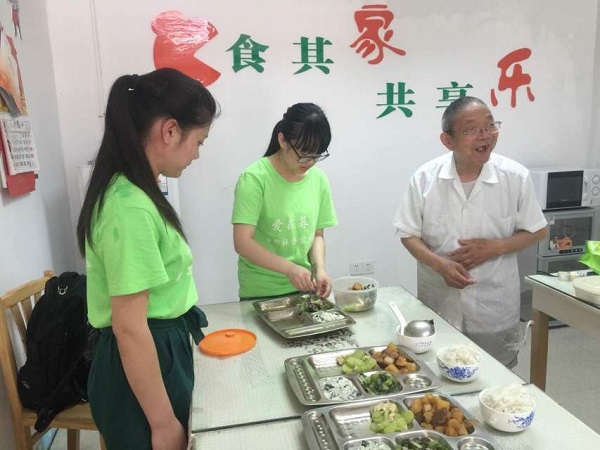 团委书记魏琳老师也来到这里,一同参与团队的实践。最后,在杨奶奶的帮助下志愿者们一共煮了五道菜。烧完菜,成员们细心地将每一道菜装到盘中,等待前来就餐的老人。将近10点,老人们陆续来到餐厅领取午餐,杨奶奶告诉大家有一位90岁高龄的老夫妻因腿脚不便可能需要送饭,这时候,魏老师与同学们一起给老人送饭,同时也带去了祝福和关怀。