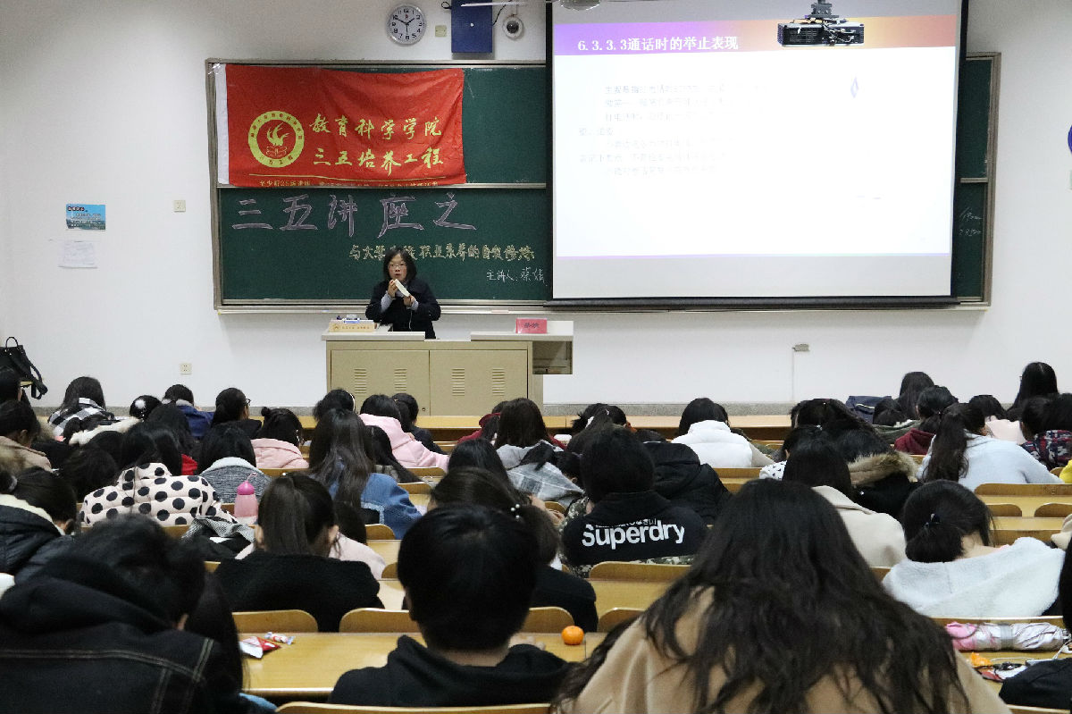 11月29日下午,蔡婧老师在4号楼205做题为“与大学生谈职业素养的自我修养”的三五讲座,本次三五讲座也是玩球直播官网 12.5心理健康宣传月的心理讲座的第一讲,全院200余人到场参与。
