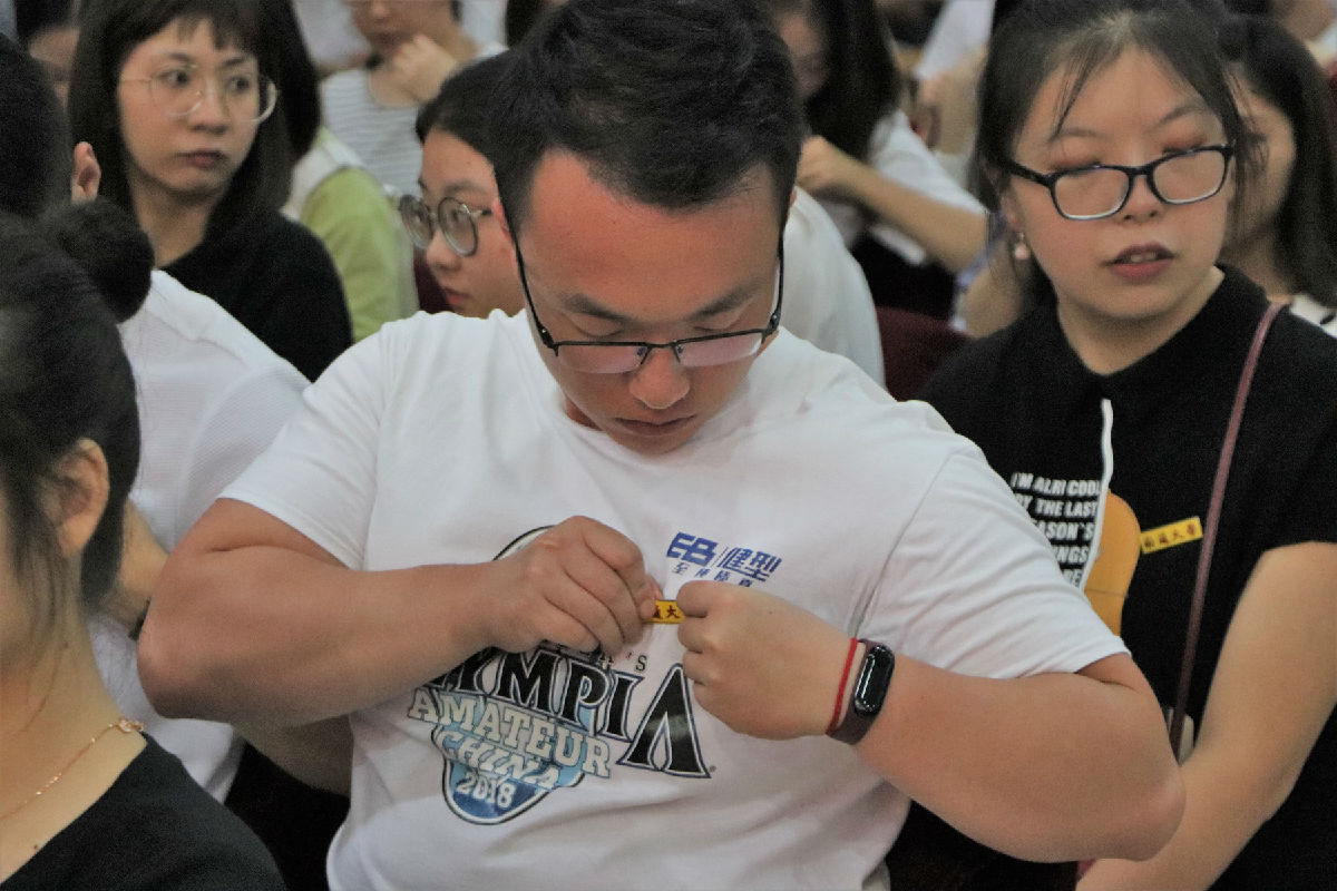 郑重为自己佩戴南通大学校徽