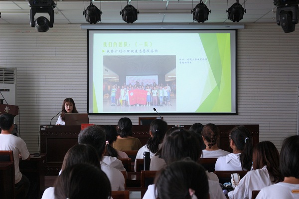 在22支实践小分队中遴选出三支优秀小分队进行了成果汇报。扶苗计划心理健康志愿服务团分主要介绍了团队历史、活动内容等方面,特别是西部计划部分,突出了“教育关爱扶贫攻坚”的主题。墨香逸雅爱心服务团的代表夏文倩着重介绍了团队实践的过程,对实践的日程分布,教学内容作了明确的讲解。情系村小爱心支教团的负责人王娅楠用丰富的图片向参会人员展示了实践的成果,教员的收获体会,总结了此次实践的感想。