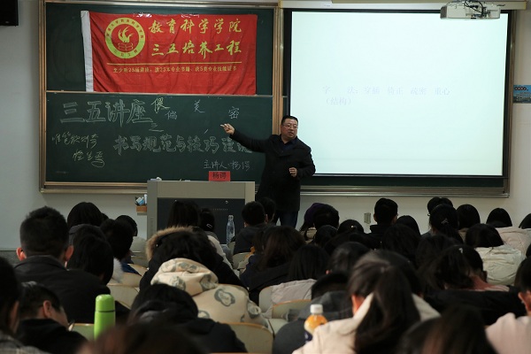 12月4日下午,玩球直播官网 于8号楼309教室举办以“书写规范与技巧漫谈”为主题的三五讲座。讲座由杨谔老师主讲,教科院280余名学生到场参加。