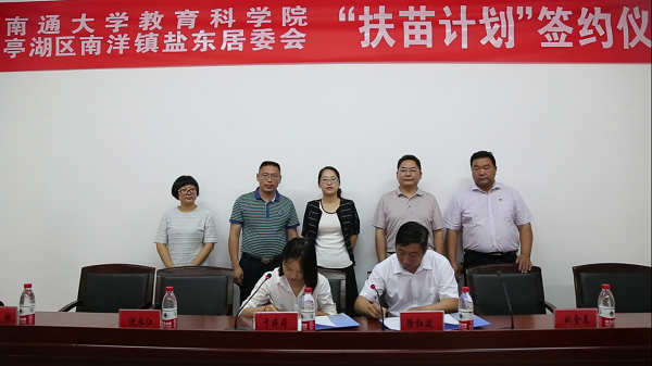 7月28日,玩球直播官网 “扶苗”新市民子女帮扶成长计划团队在院党总支副书记副院长徐红波和副院长沈永江的带领下,赴盐城市亭湖区南洋镇盐东社区,就扶苗计划的拓展签订合作协议,得到亭湖区副区长卫爱军、南洋镇党委书记徐华明、镇长于婷婷等区镇领导的热情接待。