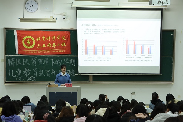 20213311330,玩球直播官网 在主校区4号教学楼105教室成功举办了以“精准扶贫视角下的早期儿童教育扶贫机制构建”为主题的三五讲座。此次讲座由杨晨晨老师主讲,来自教科院的260余名学生参加了本次讲座。