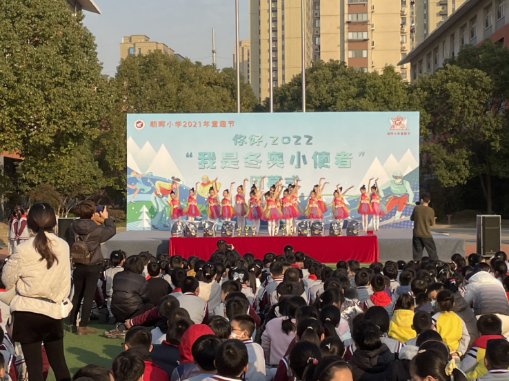随着精心排练的开场舞音乐响起,学生们的目光都齐齐汇聚在主席台上。宛转悠扬的音乐和翩翩起舞的学生,精致的礼裙搭配精心排练的舞蹈,纵使天气寒冷也不会阻碍她们的步伐,像一朵朵艳丽的鲜花逐渐绽放,彰显朝晖的风采。