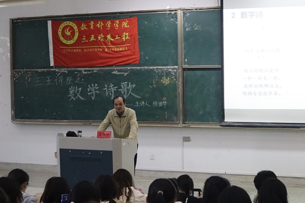 2022年11月2日下午,玩球直播官网 在九号楼202教室举办了三五培养工程之数学诗歌活动,本次活动的主讲人是玩球直播 徐伯华副教授,260位学生聆听了讲座。