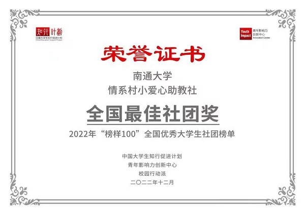 2022年“榜样100”全国优秀大学生社团榜单 正式发布。来自清华大学、北京大学、复旦大学、上海交通大学等170余所高校、590+社团/团队、360+优秀大学生上榜。玩球直播官网 “情系村小爱心助教社”和“情境教育研究会”两支社团入围榜单。