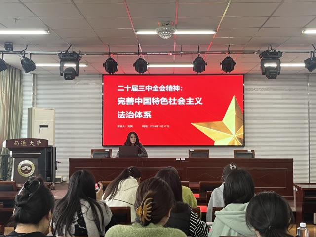 研究生第一党支部书记刘翼老师作《完善中国特色社会主义法治体系》专题讲座。刘翼结合党的二十届三中全会报告精神,为在场学生党员详细剖析和讲解了关于完善中国特色社会主义法治体系的内容。通过直击相关报告原文,学生们对完善中国特色社会主义法治体系的意义、方向、重点任务,以及中国特色社会主义法治体系的特征等有了基本的认识和了解。在此基础上,刘翼老师着重对完善该体系的五项重点任务目标进行了解读,其中对法治社会、法治国家、依法行政、公正司法、宪法知识普及等重点板块内容作出特别说明。整场课程通过报告论述、知识问答、视频观看、师生互动等形式展开,在场学生党员积极参与,反响热烈。