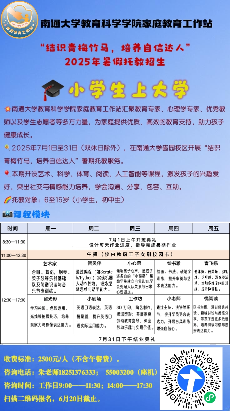 时间地点:2025年7月1日至31日(双休日除外),在南通大学啬园校区(啬园路9号)开展“结识青梅竹马,培养自信达人”暑期托教服务。