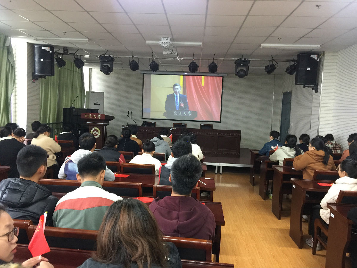 2018年11月30日上午8:30,中共南通大学第三次代表大会隆重开幕。玩球直播 全体师生热切关注校第三次党代会,玩球直播 组织学生党员和学生骨干60余人在JX18-1112会议室集中收看党代会开幕会盛况。教育科学玩球直播 辅导员、学生党员、学生干部、入党积极分子认真聆听大会报告,第一时间学习领会大会精神。