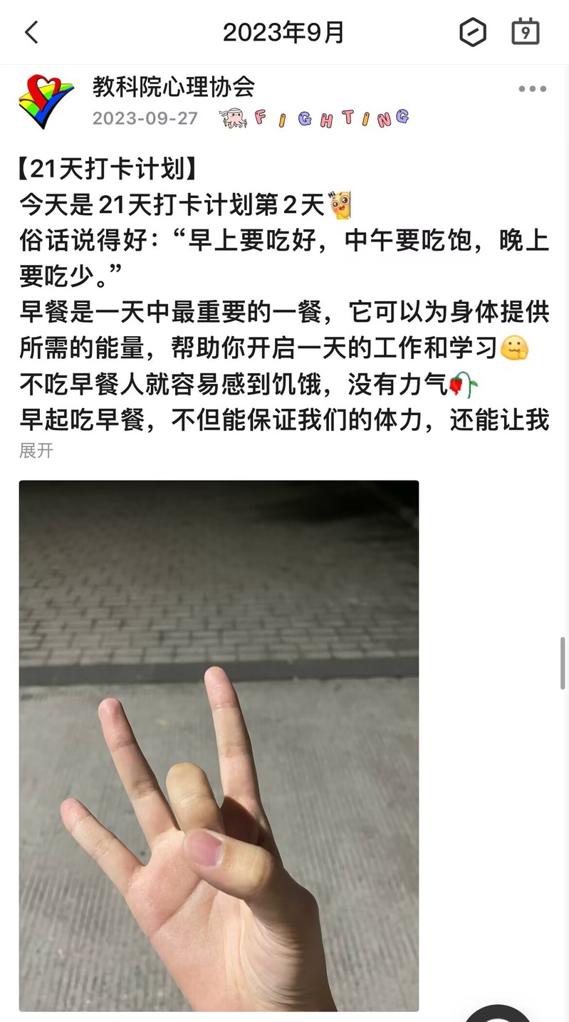 为更好地培养同学们的生活习惯,养成健康的作息规律,玩球直播 心理协会于9月26日开始举办了为期21天的以“早餐为燃料,祝你飞更高”为主题的打卡活动。