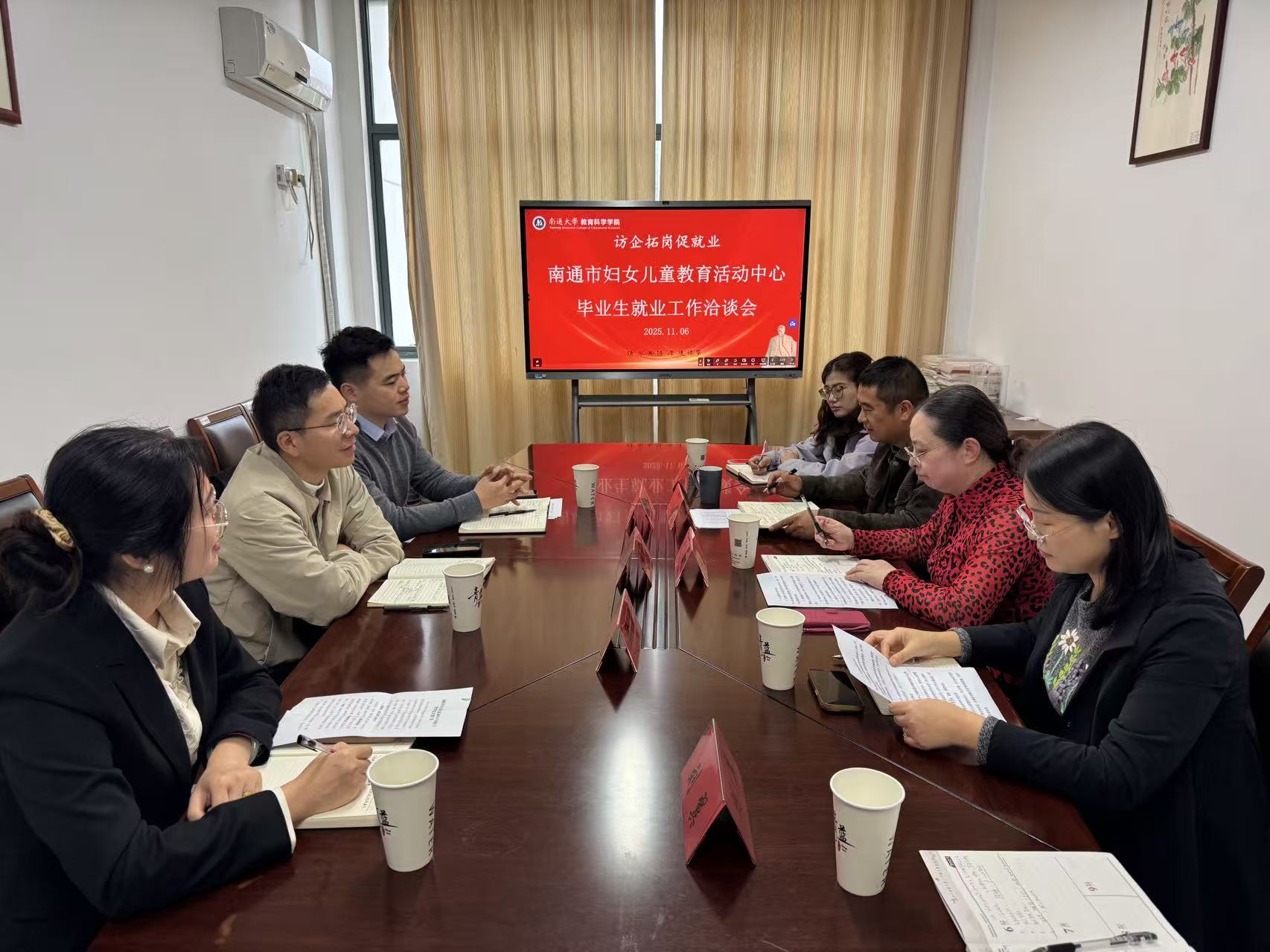 为深入贯彻党中央、国务院关于“稳就业”“保就业”决策部署,11月6日上午,玩球直播 党委副书记侯蔚率相关教师与南通市妇女儿童教育活动中心开展毕业生就业工作洽谈会,就拓展岗位资源、深化协同育人进行面对面交流。